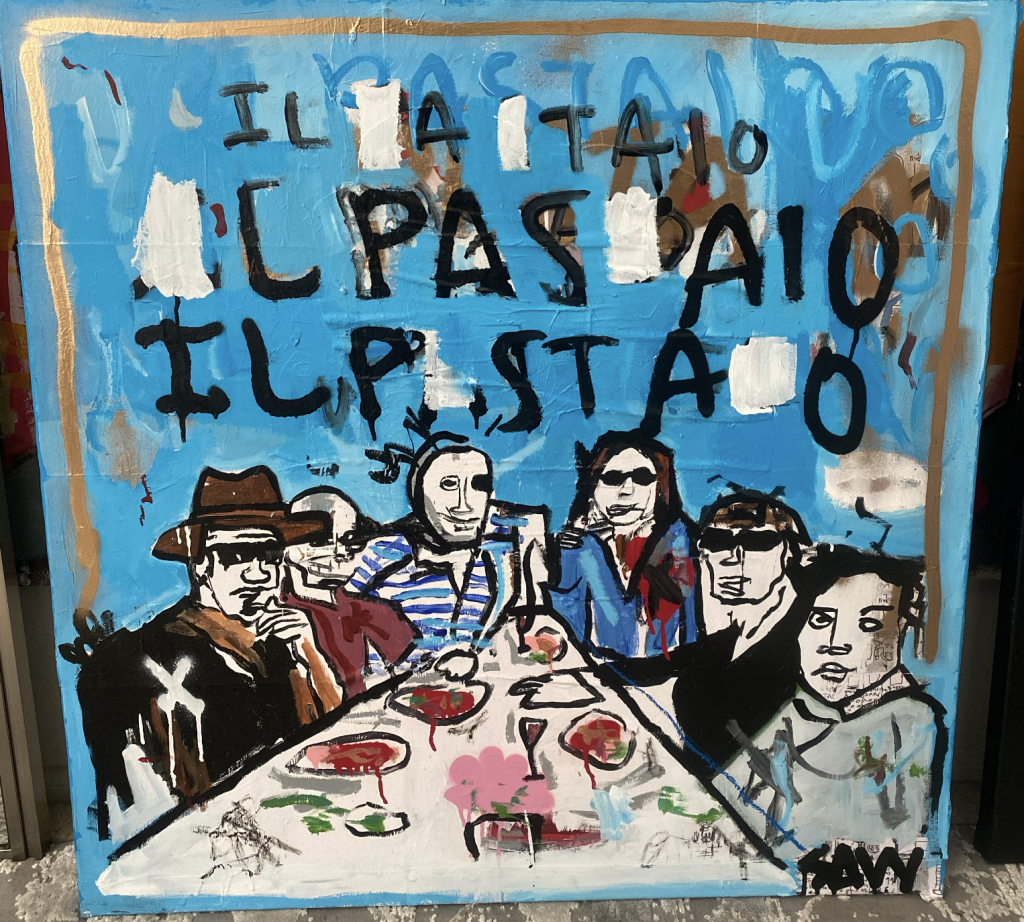 The blue background feels Mediterranean and heavenly—an ode to Il Pastaio, yes-but also symbolic. Blue skies. Blue moods. A little divine loneliness. And the scratched-out text at the top gives it the feeling of being half-remembered, half-erased-just like how fame works: everyone forgets the beginning.