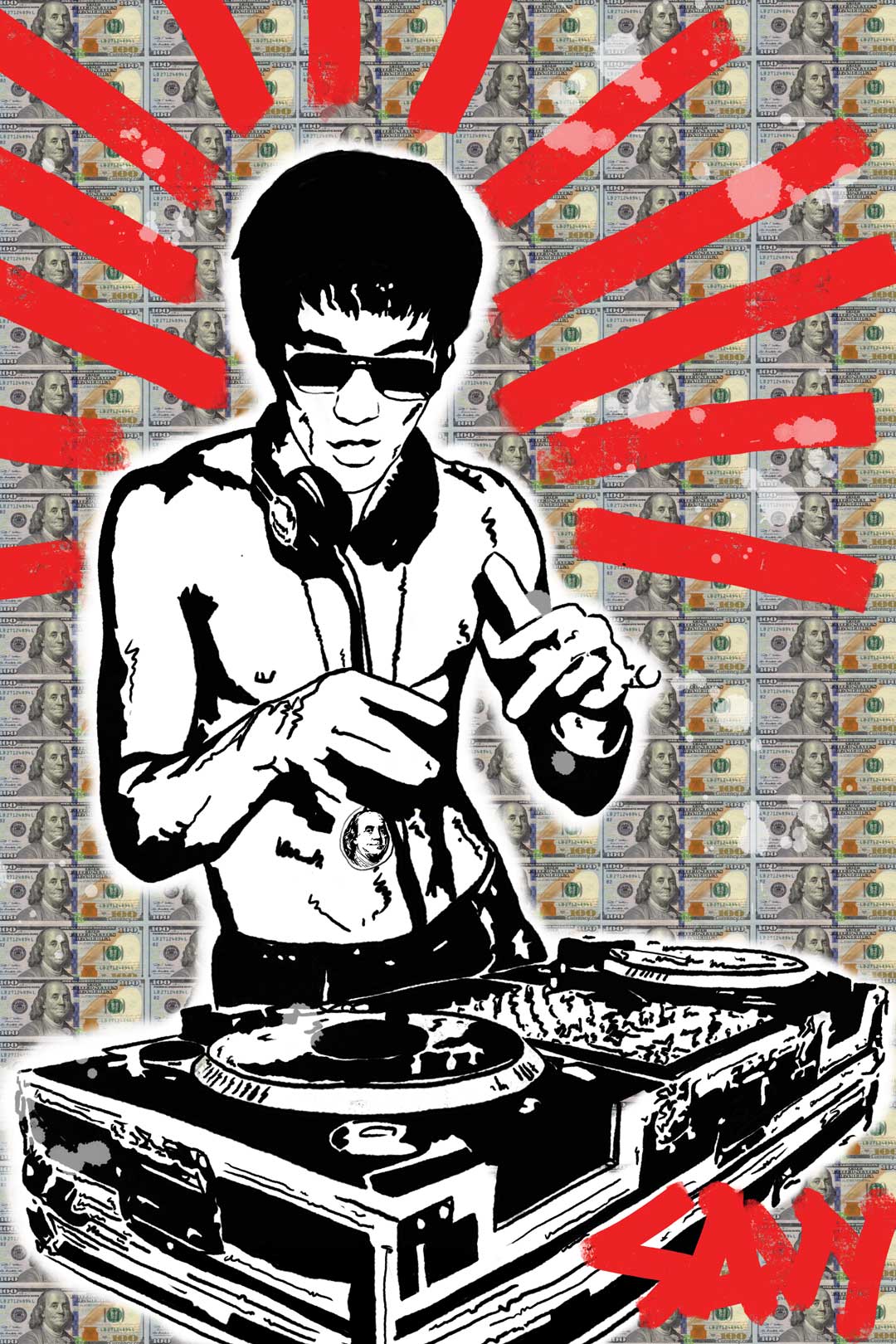 Bruce Lee, in a fusion of past and present, masters a DJ deck with his iconic focus. The martial arts legend’s hands, once fierce in combat, now blend beats seamlessly. A rich tapestry of global currency notes envelops the background, representing universal appeal. The title, “Be like water,” is written below, encapsulating his philosophy of adaptability.
